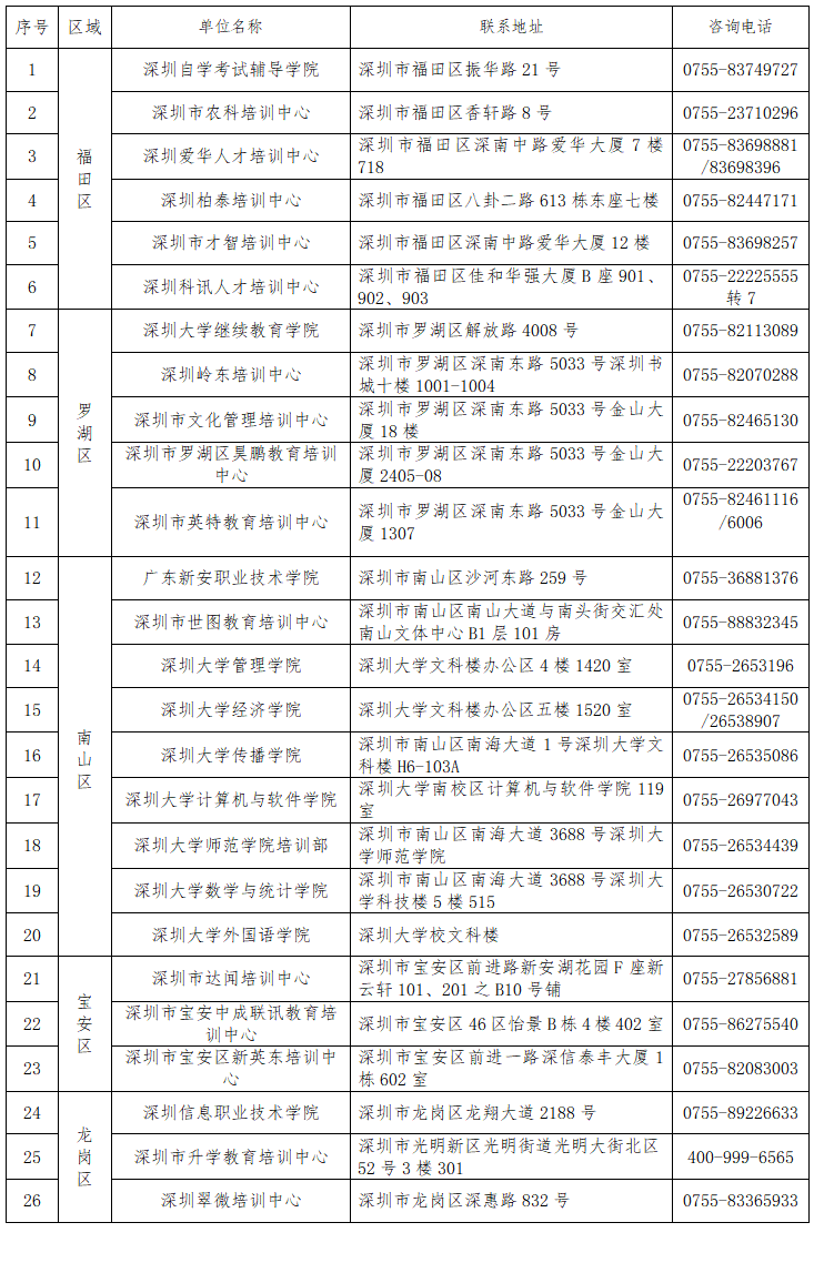 根据省考办《关于进一步加强我省自学考试社会助学机构业务指导工作的通知》(粤考办〔2015〕46号)和我办《深圳市招生考试办公室关于开展我市2017年度社会助学机构备案登记工作的通知》(深招办〔2017〕209号)精神和要求,为落实《高等教育自学考试社会助学管理试行办法》(考委办〔2010〕1号)中关于高等教育自学考试社会助学组织公告与监督制度的有关规定,增加社会助学组织(机构)信息的透明度,加强社会监督,引导广大自考考生合理选择社会助学(机构),现将我市2017年度社会助学(机构)的相关信息进行公告(详见附件),以加强社会助学组织(机构)的监督与指导。