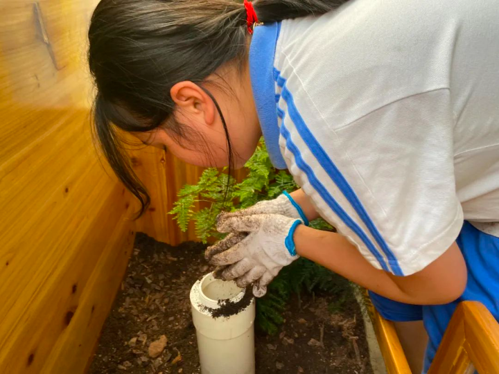 在老师的指导下,学生化身“景观设计师”,用陶粒铺底,分层叠加种植土、木屑、树皮、厨余垃圾等干湿材料,把蚯蚓塔耸立于厚土中。一节课程结束后,蚯蚓、蝴蝶、栀子花、蒲公英等动植物分别在教学楼的10处小阳台上“安家”。这是龙华教科院附小四年级“校园园艺劳动”主题课程的项目式学习场景之一。