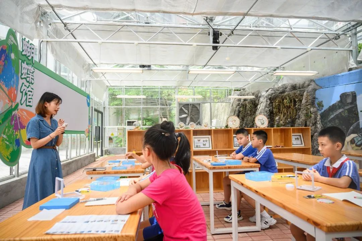 龙华教科院附小充分结合“双减”,打造了20多个劳动教育工坊,如酷可厨艺坊、自然探秘坊、陶艺工作坊、趣味中草园、家务劳动体验馆等。如何在有限空间里探索劳动“新天地”?该校将现有的天台、校内小花园等地升级改造,充分利用有限资源搭建天台农场、玻璃屋等。