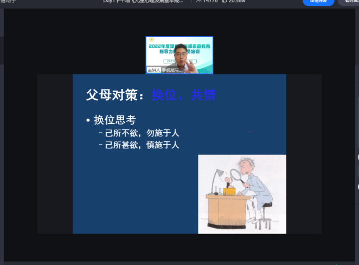 本期培训非常火爆,得到老师们的一致好评,共收到超6万条评论:“这么高质量的培训可以多来点”,“主题理论性很强又兼顾实践性”,“王老师讲得太好了,讲到我们心里去了”,“老师知识渊博,天文地理、古今中外、名人名言、各种观点、各个学派”……通过这次深圳市教师家庭教育指导力开年线上培训,老师们收获满满,为今后开展家庭教育打下了扎实的理论基础和实践经验。