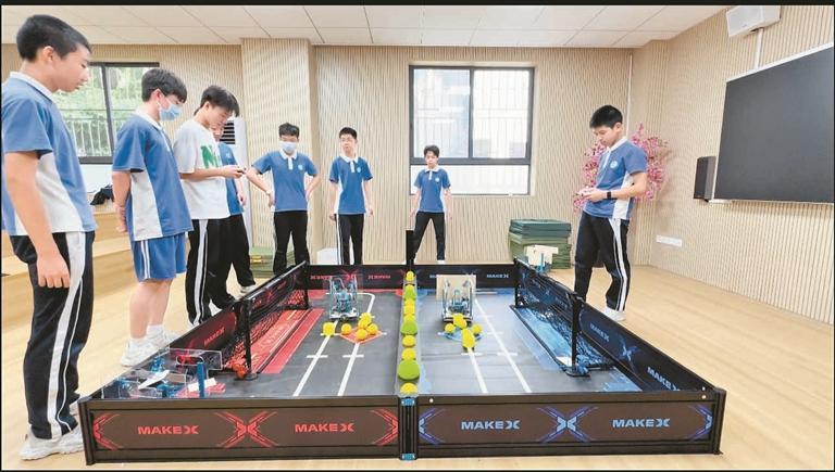 翠园东晓中学学生课间操作自己在科创社团组装编程的机器人。