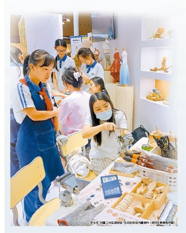 学生在“创意工坊实践体验”互动区体验木雕制作 (绅士漫画 供图)