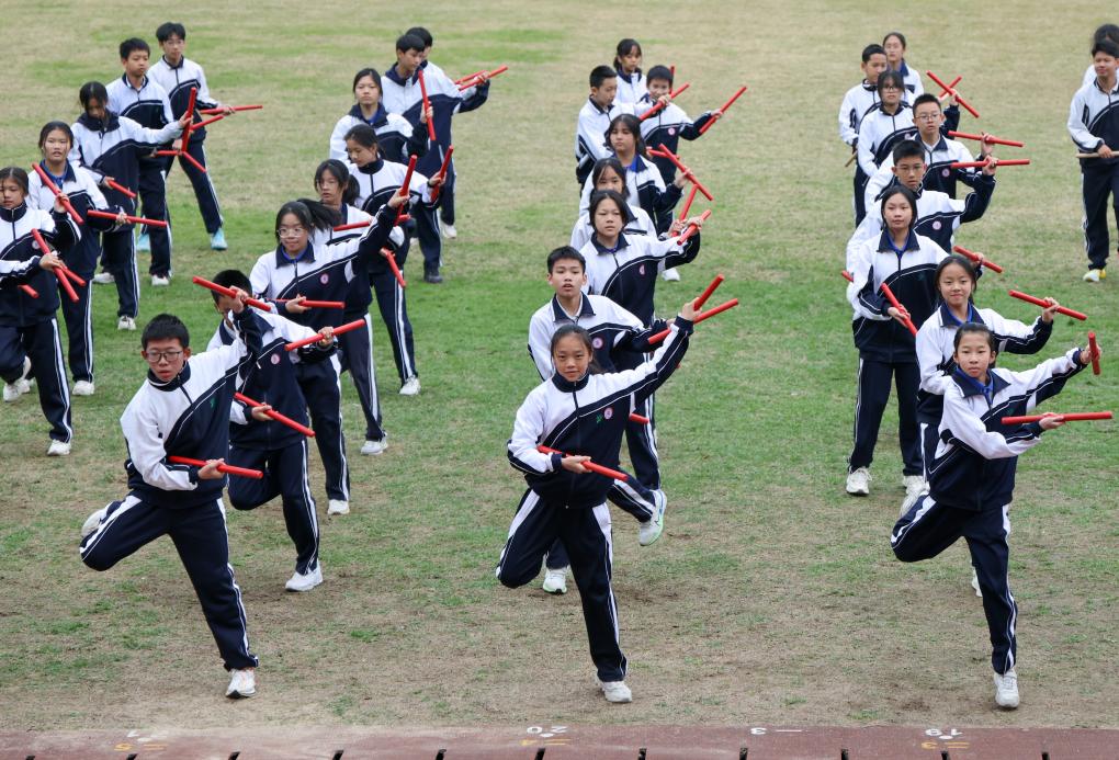 2024年12月23日,深圳大学附属中学初中部的学生在体育课上练习英歌舞。新华社记者 梁旭 摄