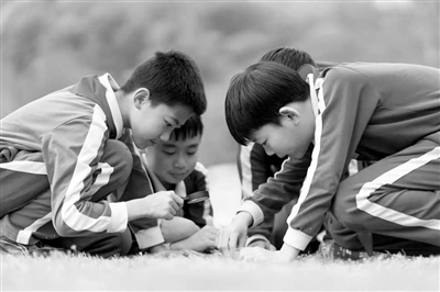 学校组织学生们到野外考察,学生们正在用放大镜进行科学观察。