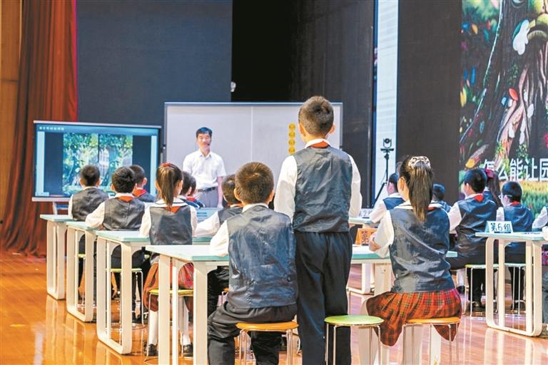 在课例展示环节,麓城外国语小学信息科技科组长樊乐和学生共同展示课例《探码——设计校园植物“身份”编码》。他引导学生通过三个学习任务——设计校园植物“身份”编码规则、通过系统进行批量编码、对话AI工具,综合运用信息科技知识和手段优化植物编码,用数学进行逻辑推理,用科学进行探究实践。
