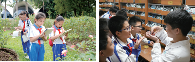 每周,学生们分批走进梧桐山,通过林间生态观察、动植物标本采集等沉浸式活动,于大自然中学习。课程紧扣梧桐山花期,以毛棉杜鹃、鸡冠刺桐、凤凰木等特色植物为主题展开教学。