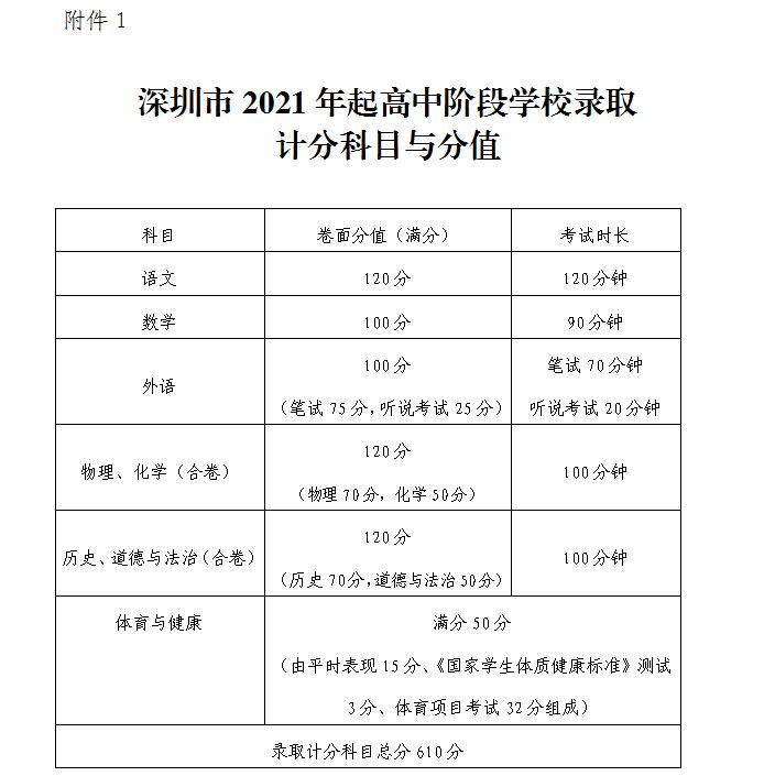 附件:1.深圳市2021年起高中阶段学校录取计分科目与分值